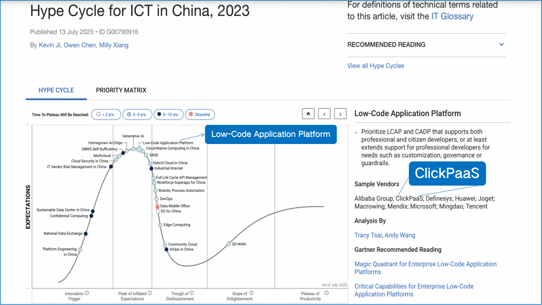 近日,国际权威研究机构Gartner发布了《Hype Cyple for ICT in China,2023(2023年中国ICT技术成熟度曲线)》报告,南宫28圈地址新版凭借平台的aPaaS+iPaaS+DaaS保障业务系统的一站式设计,多租户、热发布、国际化、信创安全等特性实力登榜,并作为低代码PaaS平台代表厂商TOP2入选本次报告。